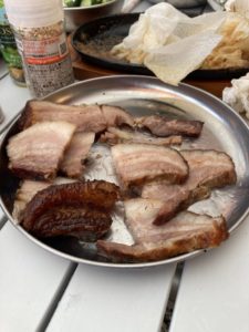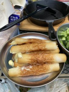 ダッチオーブンを使った燻製4連発。私は一番下の豚肉の塩漬けを持っていきました。もちろん人のダッチオーブンを使って。