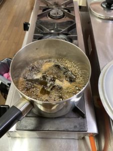 骨から肉が外れるくらい煮込んだら、加水するのを止め、濃度を濃くしていきます。(今回は濃くしすぎました笑)